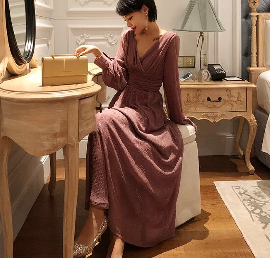 演奏会ドレス レディース パーティードレス 結婚式ドレス ワンピース ロングワンピース Vネック カシュクール 長袖 ラメ きらきら きれいめ エレガント お呼ばれ フォーマル ハイウエスト 女性