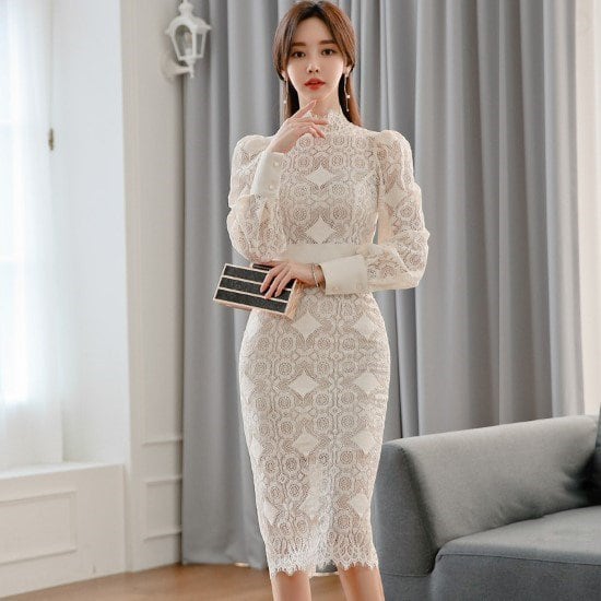 パーティードレス レディース 総レースワンピース 結婚式ドレス 演奏会ドレス きれいめ エレガント お呼ばれ フォーマル 長袖 スタンドカラー レース スリット 膝丈ワンピース ハイウエスト 女性