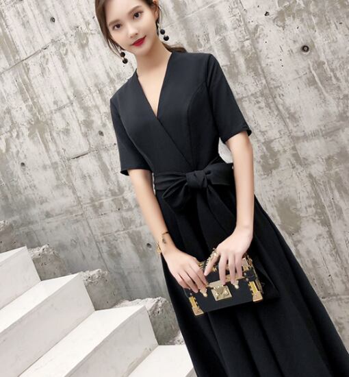 演奏会ドレス レディース パーティードレス 結婚式ドレス ワンピース ロングワンピース Vネック ウエストリボン ハイウエスト 半袖 きれいめ エレガント シンプル おしゃれ お呼ばれ フォーマル