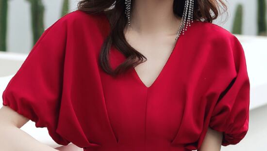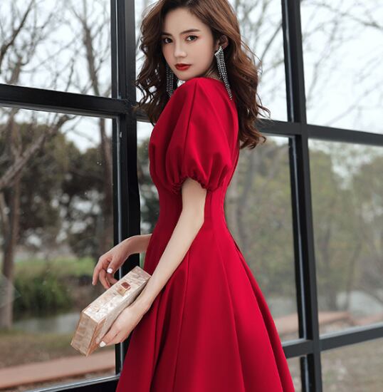 パーティードレス レディース ワンピースドレス 結婚式ドレス 演奏会ドレス きれいめ お呼ばれ エレガント フォーマル シンプル 無地 ボリューム袖 パフスリーブ Vネック フレアスカート Aライン