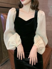 パーティードレス レディース 結婚式ドレス 演奏会ドレス ワンピースドレス コントラストカラー ボリューム袖 長袖 きれいめ エレガント お呼ばれ フォーマル ミドル丈ワンピース シンプル 無地