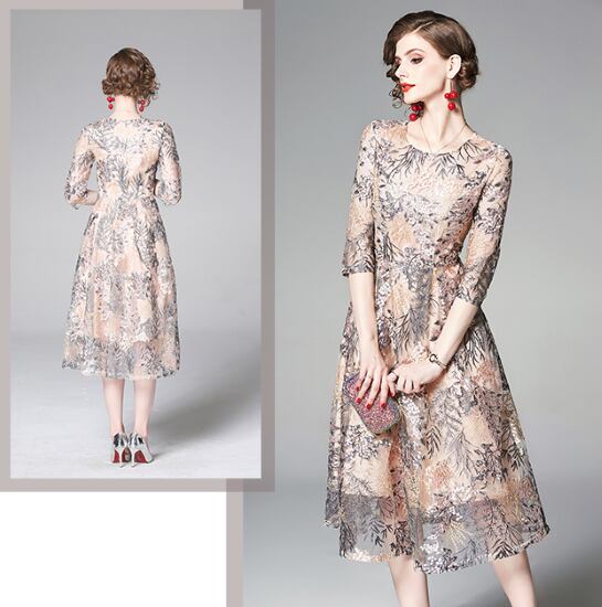 パーティードレス レディース ワンピースドレス 結婚式ドレス 演奏会ドレス 刺繍 ラウンドネック きれいめ エレガント お呼ばれ フォーマル 七分袖 Aラインスカート ミドル丈ワンピース 花柄