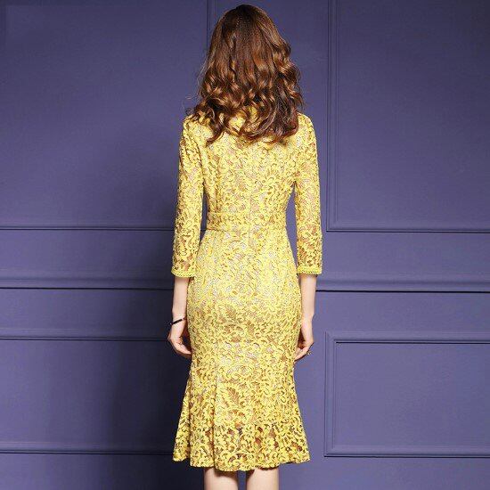パーティードレス レディース ワンピースドレス 結婚式ドレス 演奏会ドレス マーメイドシルエット きれいめ エレガント 総レース ラウンドネック 七分袖 スリムフィット お呼ばれ フォーマル イエロー