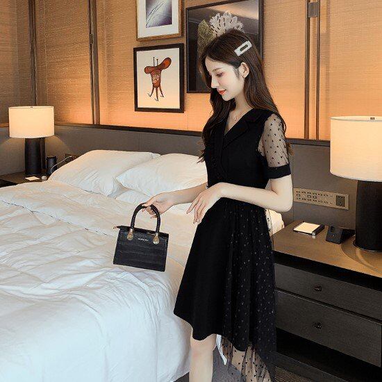 パーティードレス レディース ワンピースドレス 結婚式ドレス 演奏会ドレス シースルー きれいめ エレガント お呼ばれ フォーマル ブラック 黒 Vネック 水玉 ドット柄 ハイウエスト アシンメトリー