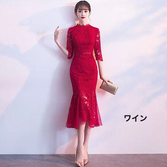 結婚式ドレス レース マーメイド 発表会 演奏会 レディース タイト 結婚式 ステージ衣装 五分袖 ミディアム丈 エレガント ウエディングドレス カラードレス シースルー ラグジュアリー