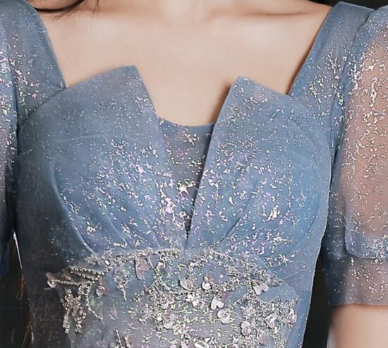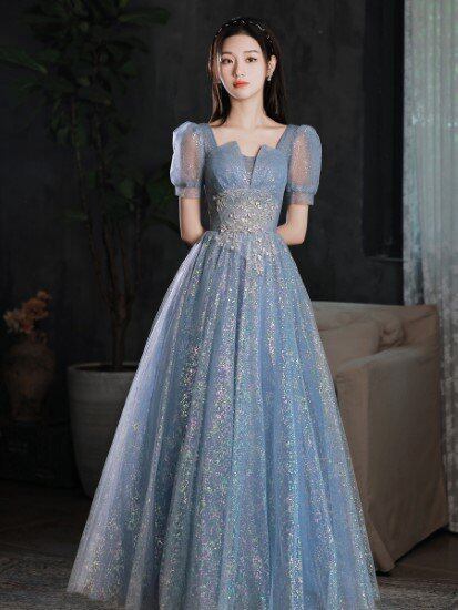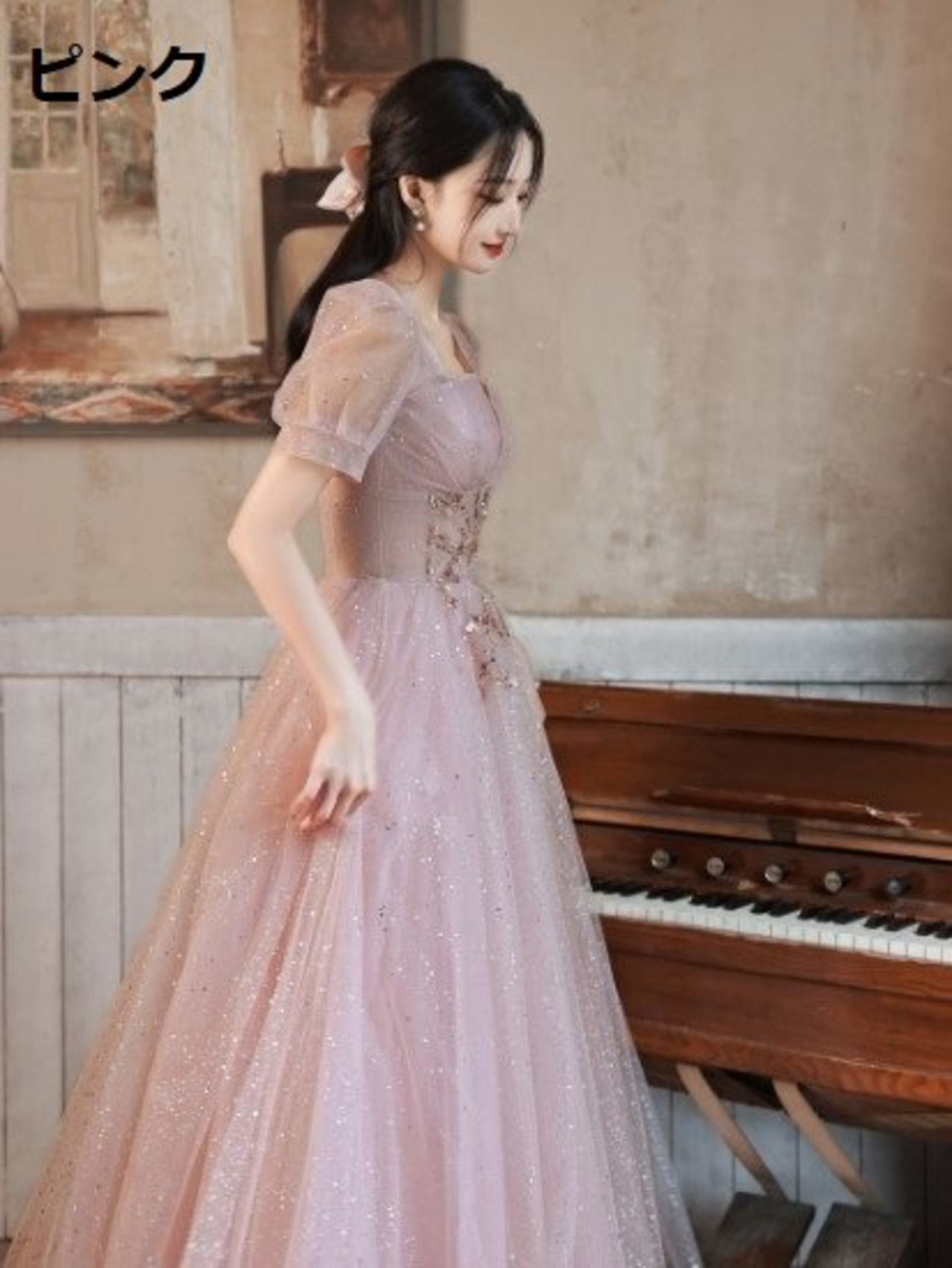 演奏会ドレス レディース パーティードレス 結婚式ドレス ワンピースドレス プリンセス パフスリーブ 半袖 きれいめ エレガント Aラインスカート ラメ きらきら ブルー ピンク 二次会 お呼ばれ