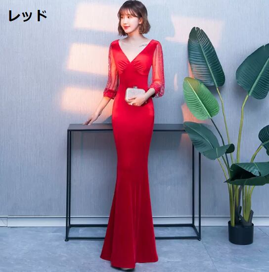 演奏会ドレス レディース 結婚式ドレス パーティードレス ワンピースドレス ロングワンピース マーメイドシルエット きれいめ エレガント Vネック スリムフィット きらきら 七分袖 女性 パーティー