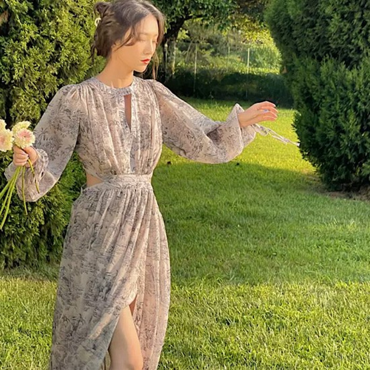 揺れるシフォンを組合わせたヨーロピアンワンピース透け感が美しい軽やかなドレス!