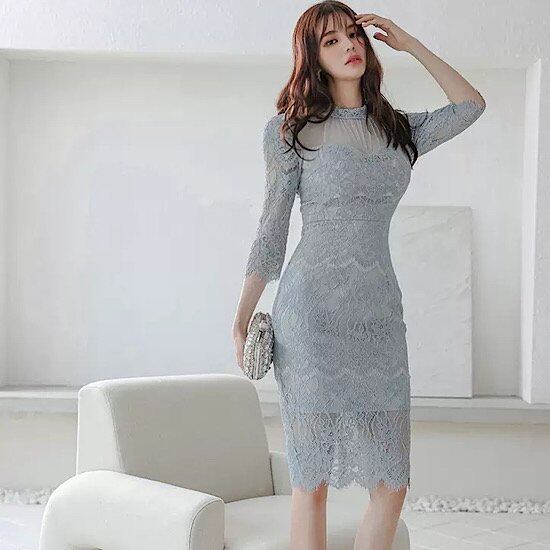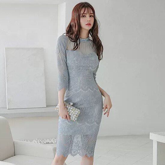 結婚式ドレス ミモレ丈 シースルー ハイネック スリムフィット タイト レース 発表会 演奏会 レディース 結婚式 ステージ衣装 エレガント ウエディングドレス カラードレス イブニングドレス