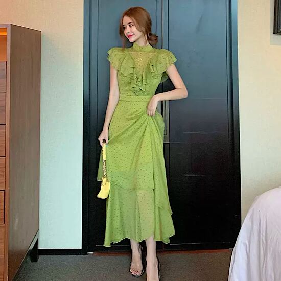 結婚式ドレス ドット柄 フリル ハイウエスト シフォン フレンチ シースルー ハイネック 発表会 演奏会 レディース フ結婚式 ステージ衣装 半袖 ロング丈 エレガント ウエディング カラードレス