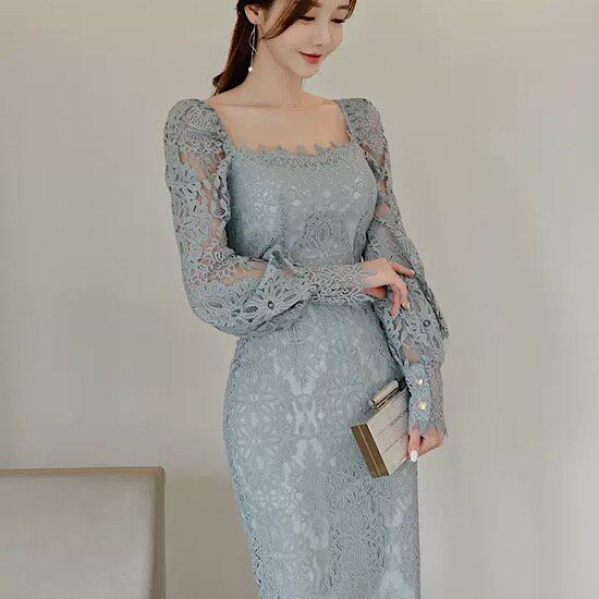 結婚式ドレス スクエアネック 長袖 刺繍 スリムフィット タイト ミモレ丈 レース セレブ 発表会 演奏会 レディース 結婚式 ステージ衣装 エレガント ウエディングドレス カラードレス