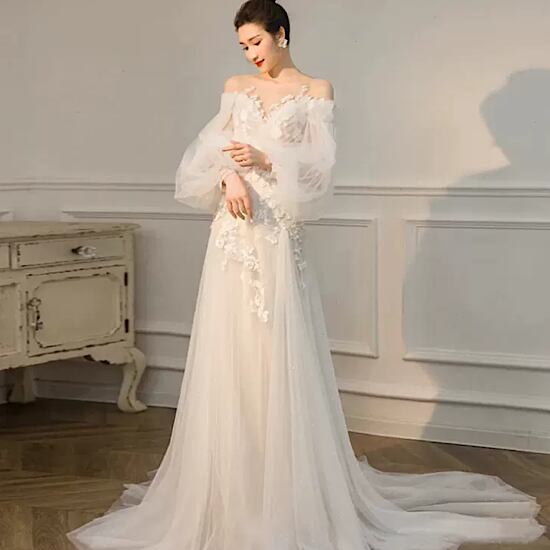 ウエディングドレス オフショルダー 刺繍 セクシー フレンチ レース 発表会 演奏会 レディース 結婚式 ステージ衣装 マキシ丈 エレガント カラードレス 長袖 ハートカット 結婚式ドレス