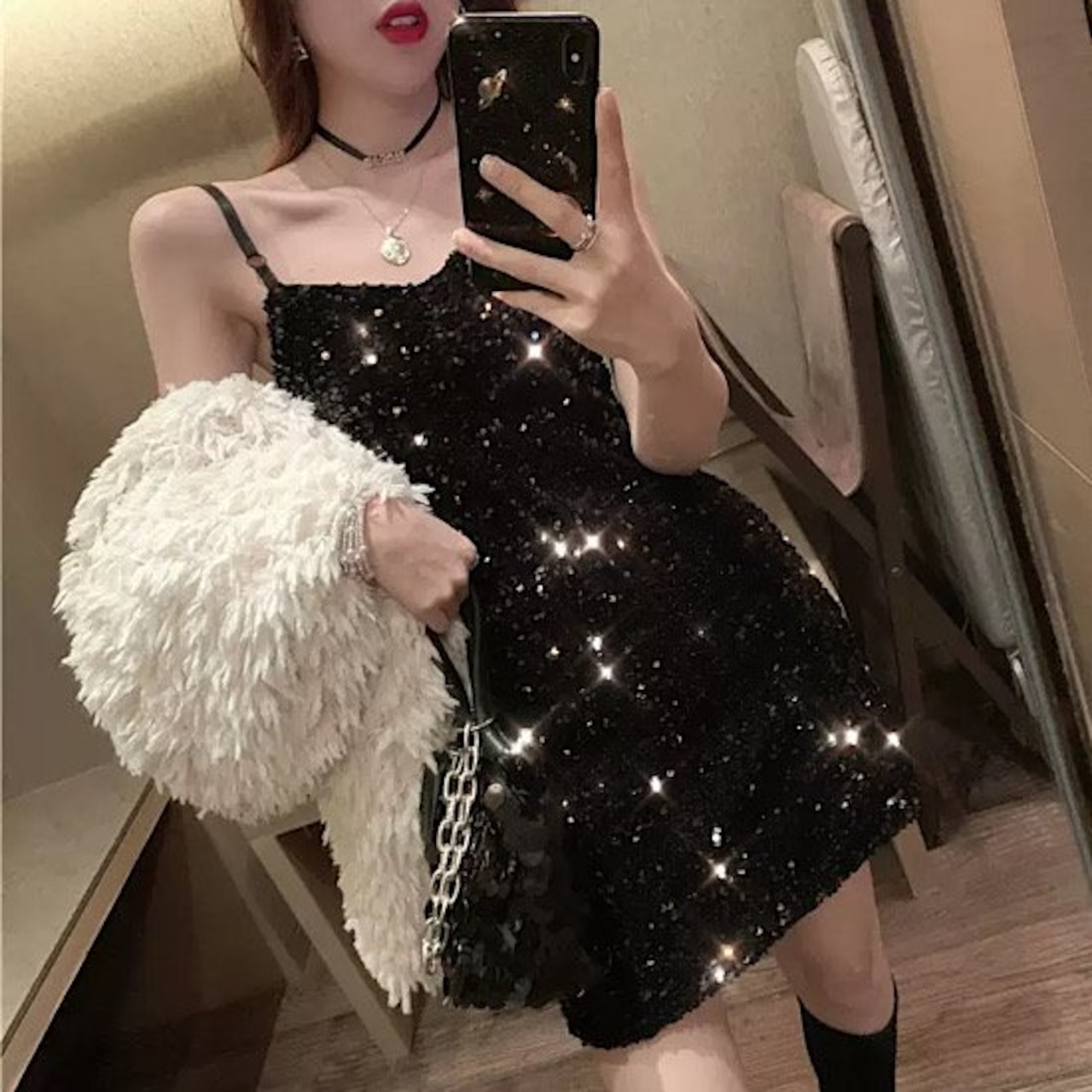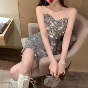 総スパンコールで全身キラキラなミニドレス。