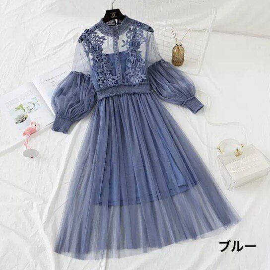 結婚式ドレス レース 長袖 ラウンドネック シースルー レトロ 透け感 発表会 演奏会 レディース フレアドレス 結婚式 ステージ衣装ミモレ丈 エレガント ウエディングドレス カラードレス
