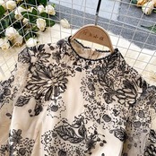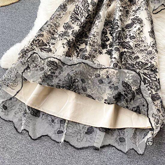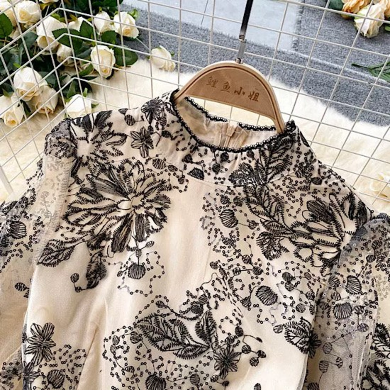 結婚式ドレス 刺繍 花柄 綺麗め ラウンドネック メッシュ エレガント 発表会 演奏会 レディース フレアドレス 結婚式 ステージ衣装 ミモレ丈 エレガント ウエディングドレス カラードレス
