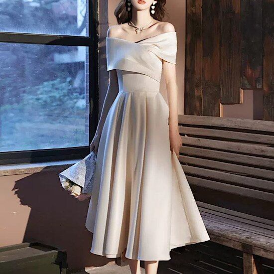 ウエディングドレス 結婚式ドレス オフショルダー イブニングドレス 発表会 演奏会 レディース フレアドレス 結婚式 ステージ衣装 ミモレ丈 エレガント ウエディングドレス カラードレス
