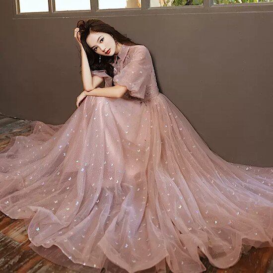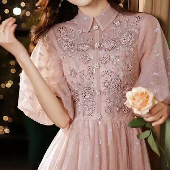 結婚式ドレス パフスリーブ ハイウエスト 襟付き ロング丈 発表会 演奏会 レディース 結婚式 ステージ衣装 エレガント ウエディングドレス カラードレス イブニングドレス 五部袖