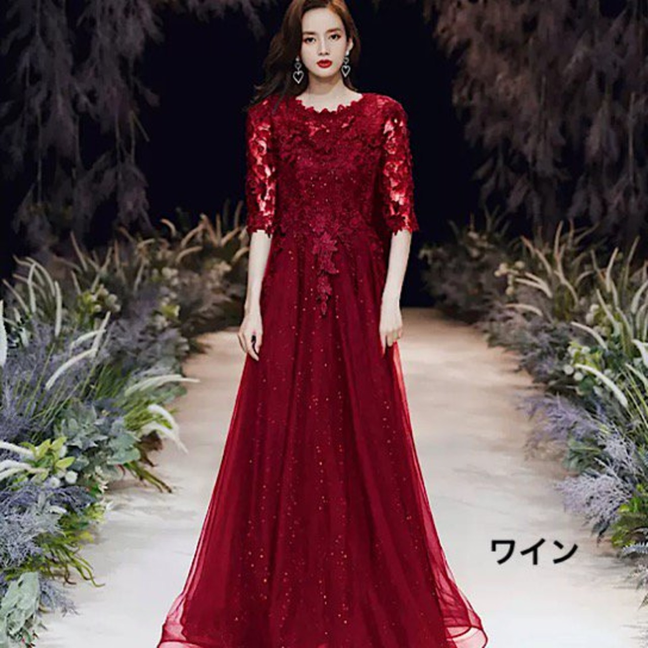 結婚式ドレス イブニングドレス レース ラウンドネック キラキラ 五部袖 ロング丈 ハイウエスト 発表会 演奏会 レディース 結婚式 ステージ衣装 エレガント カラードレス イブニングドレス