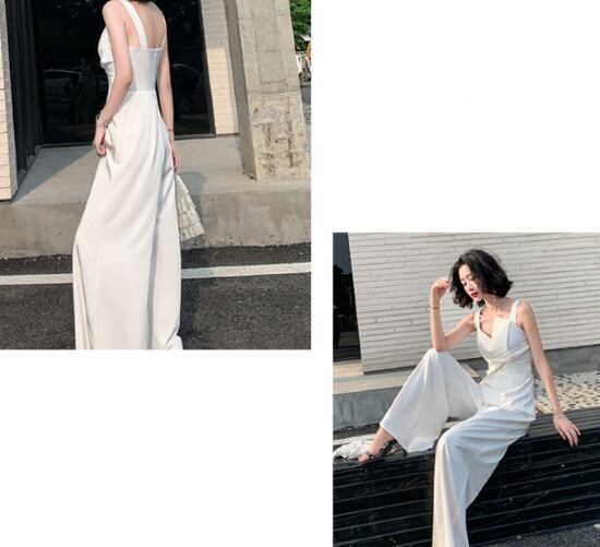 アシンメトリーな胸元デザインがおしゃれなパンツドレス。