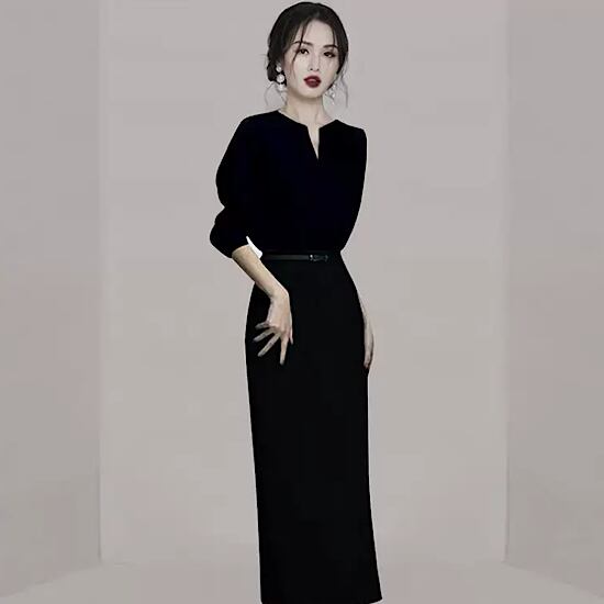 結婚式ドレス 無地 シンプル Vネック 長袖 ミモレ丈 ハイウエスト 発表会 演奏会 レディース 結婚式 ステージ衣装 エレガント ウエディングドレス カラードレス イブニングドレス