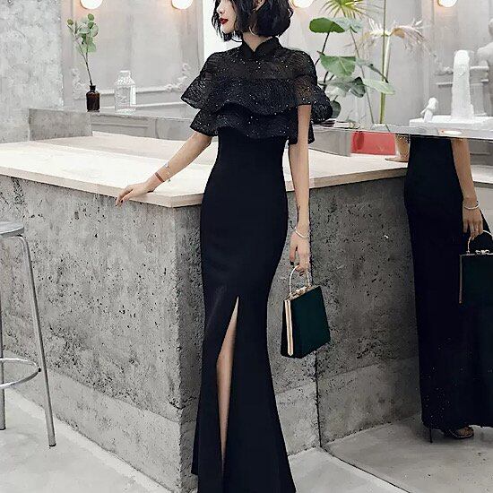 結婚式ドレス フリル スリムフィット スリット ロング丈 キラキラ ハイネック 発表会 演奏会 レディース 結婚式 ステージ衣装 エレガント ウエディングドレス カラードレス イブニングドレス