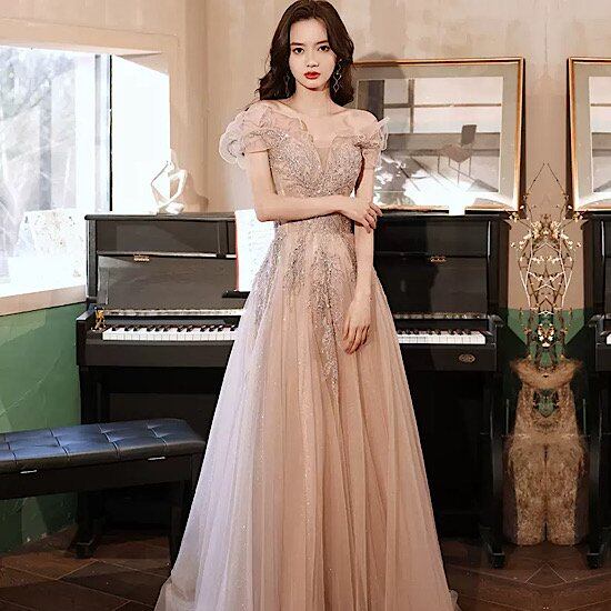 結婚式ドレス オフショルダー ヌーディーカラー プリンセス マキシ丈 ハイウエスト 発表会 演奏会 レディース 結婚式 ステージ衣装 エレガント ウエディングドレス カラードレス イブニングドレス