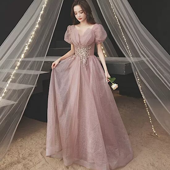 結婚式ドレス レース マキシ丈 パフスリーブ ハイウエスト 発表会 演奏会 レディース 結婚式 ステージ衣装 エレガント ウエディングドレス カラードレス イブニングドレス プリンセスライン