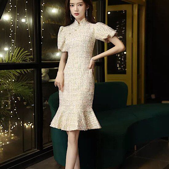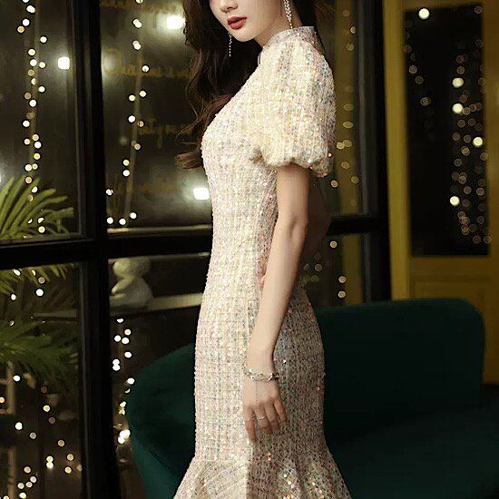 結婚式ドレス チャイナ風 マーメイド ツイード ミモレ丈 ハイウエスト 発表会 演奏会 レディース 結婚式 ステージ衣装 エレガント ウエディングドレス カラードレス イブニングドレス