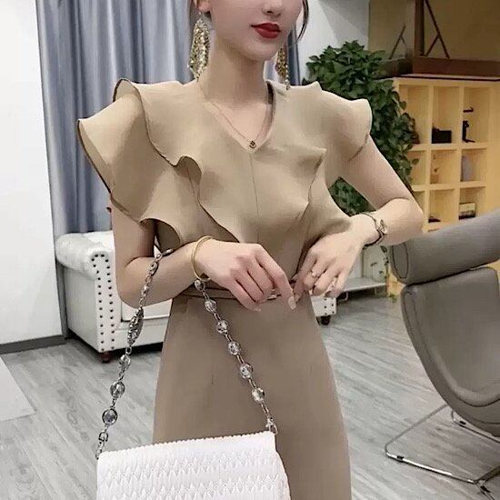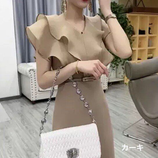 結婚式ドレス フリル 無地 シンプル ノースリーブ ミモレ丈 発表会 演奏会 レディース 結婚式 ステージ衣装 エレガント ウエディングドレス カラードレス イブニングドレス Vネック