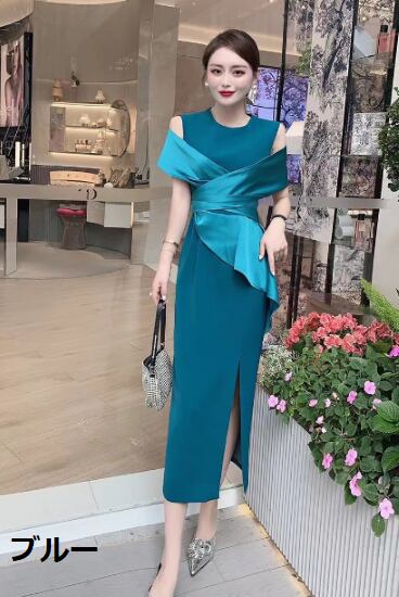 パーティードレス レディース 演奏会ドレス 結婚式ドレス ワンピースドレス 肩見せ フリル ラウンドネック ロングワンピース エレガント きれいめ フォーマル 二次会 イブニングドレス スリット