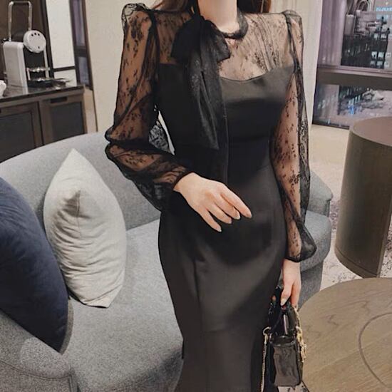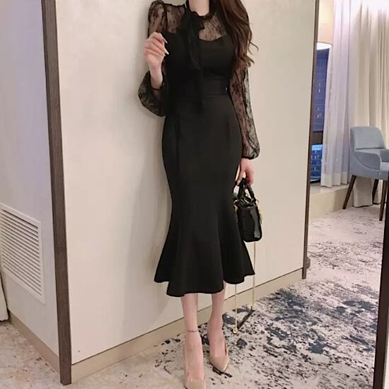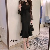 結婚式ドレス レース ネクタイ 長袖 ハイウエスト タイト スリム 無地 ミモレ丈 発表会 演奏会 レディース 結婚式 ステージ衣装 エレガント カラードレス イブニングドレス シック