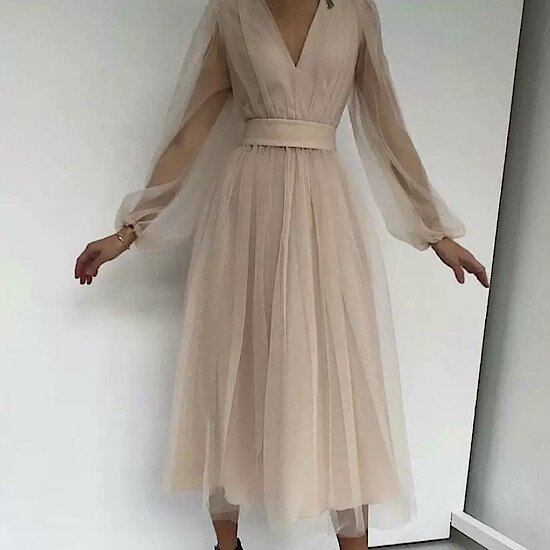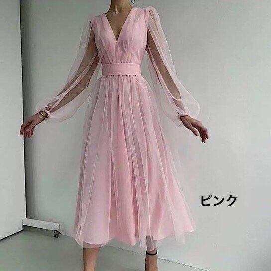 結婚式ドレス Vネック メッシュ ミモレ丈 長袖 シースルー ハイウエスト 発表会 演奏会 レディース 結婚式 ステージ衣装 エレガント ウエディングドレス カラードレス イブニングドレス
