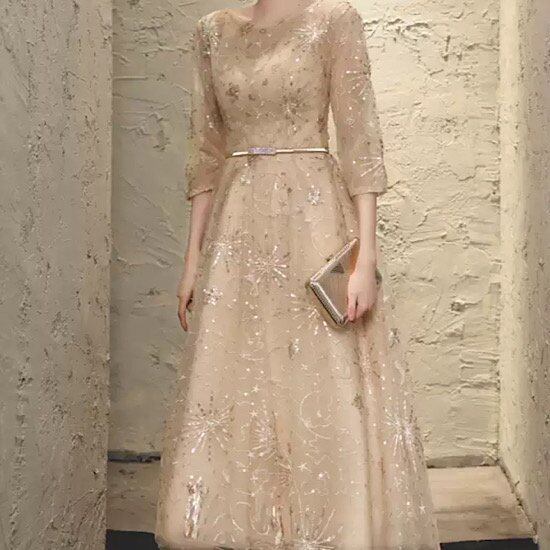 ナイトドレスにぴったりなキラキラミモレ丈ドレス。