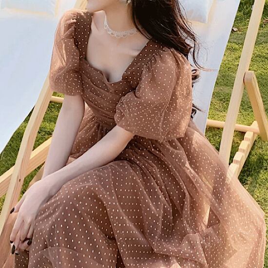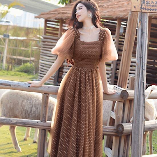 結婚式ドレス フレンチ レトロ 水玉 メッシュ スクエアネック パフスリーブ 発表会 演奏会 レディース 結婚式 ステージ衣装 エレガント ウエディングドレス カラードレス イブニングドレス