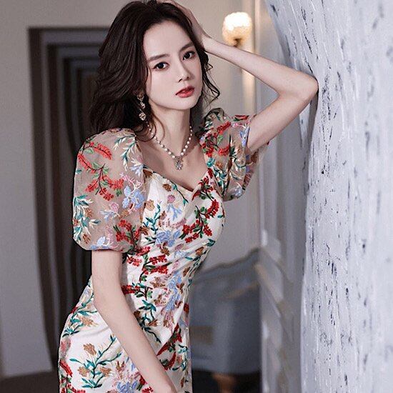 結婚式ドレス 花柄 パフスリーブ ハートカット スリム ロング丈 発表会 演奏会 レディース 結婚式 ステージ衣装 エレガント ウエディングドレス カラードレス イブニングドレス 刺繍