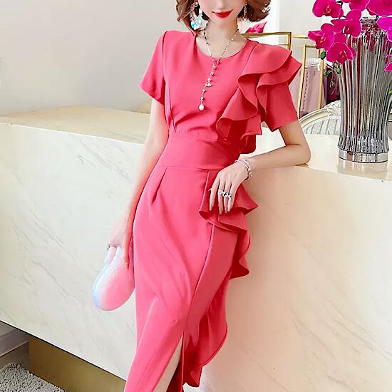 結婚式ドレス 細見え タイトスカート スリット フリル 半袖 発表会 演奏会 レディース 結婚式 ステージ衣装 エレガント ウエディングドレス カラードレス イブニングドレス ミモレ丈