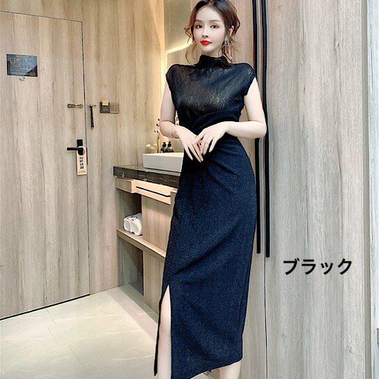 結婚式ドレス ハイネック スリムフィット スリット ノースリーブ ミモレ丈 発表会 演奏会 レディース 結婚式 ステージ衣装 エレガント ウエディングドレス カラードレス イブニングドレス 、
