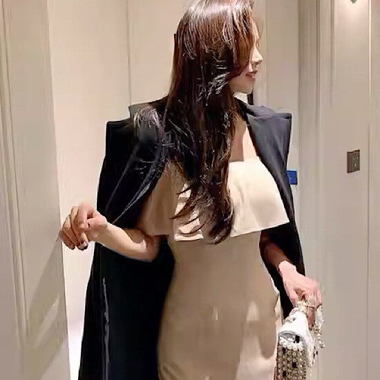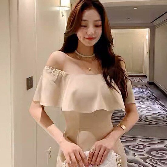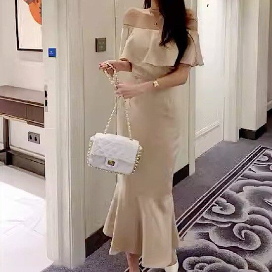 結婚式ドレス オフショルダー フリル マーメイドスカート スリム ミモレ丈 発表会 演奏会 レディース 結婚式 ステージ衣装 エレガント ウエディングドレス カラードレス イブニングドレス