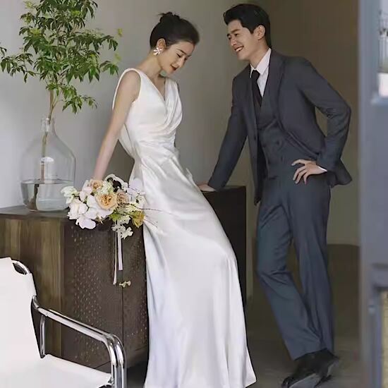 結婚式ドレス Vネック スリット ロング丈 ノースリーブ 無地 シンプル 発表会 演奏会 レディース 結婚式 ステージ衣装 エレガント ウエディングドレス カラードレス イブニングドレス