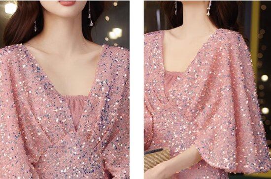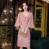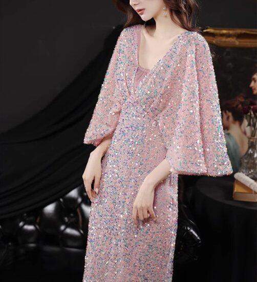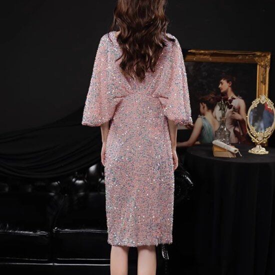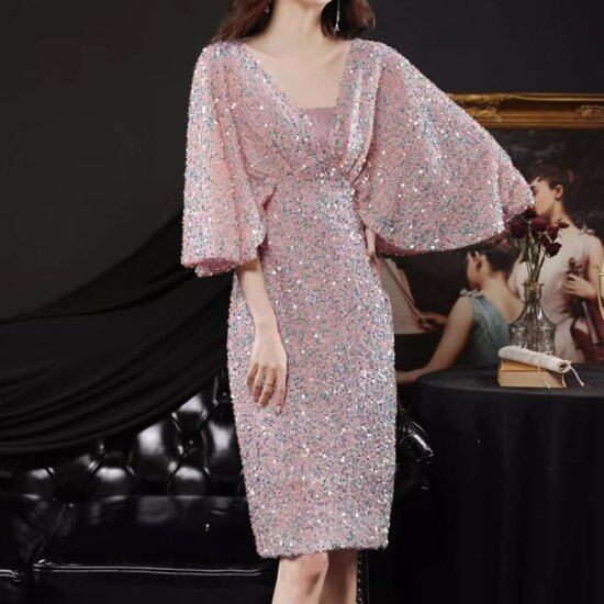 結婚式ドレス レディース ミディアム丈 バットスリーブ スパンコール Vネック 五分袖 ハイウエスト 演奏会 発表会 ステージ衣装 イブニングドレス 華やか エレガント パーティー ワンピース