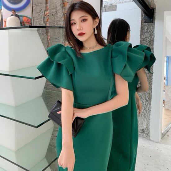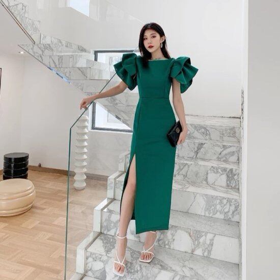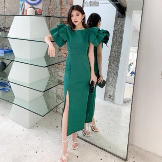 結婚式ドレス レディース フリルスリーブ ロング丈 スリット ラウンドネック 半袖 ボリューム袖 フリル袖 演奏会 発表会 ステージ衣装 カラードレス 華やか パーティードレス 緑 グリーン