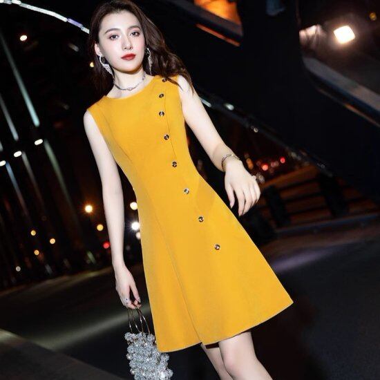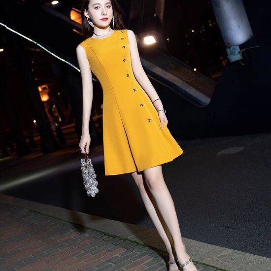 結婚式ドレス レディース ミニドレス ノースリーブ Aライン ノーカラー ミニ丈 ひざ丈 スリム 発表会 二次会 披露宴 パーティードレス イブニングドレス イエロー かわいい 華やか ワンピース