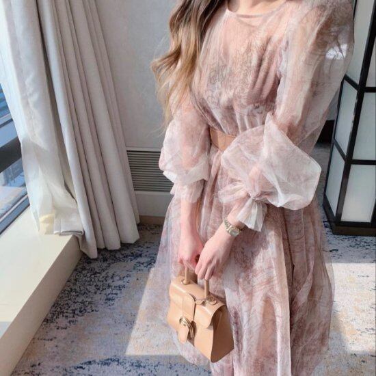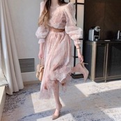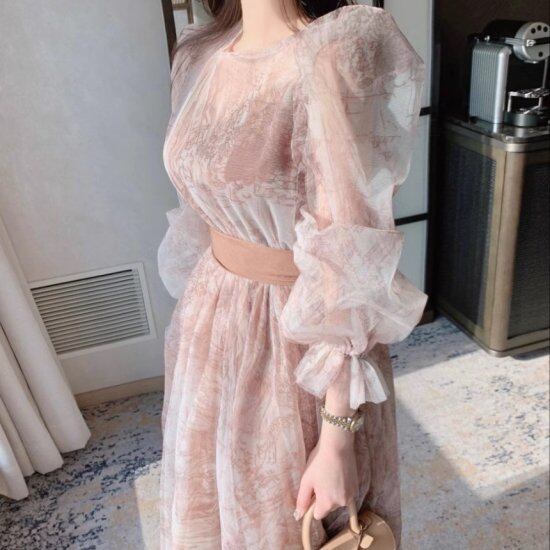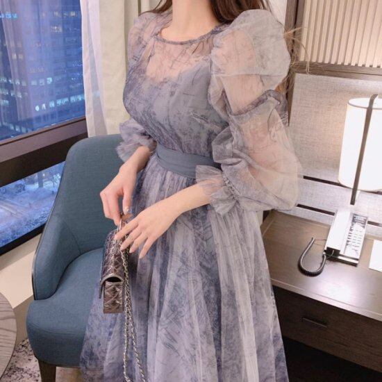 結婚式ドレス レディース パフスリーブ 透け感 シースルー ミモレ丈 ミディアム丈 ウエストリボン 長袖 演奏会 発表会 披露宴 二次会 ステージ衣装 パーティードレス かわいい ワンピース