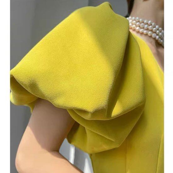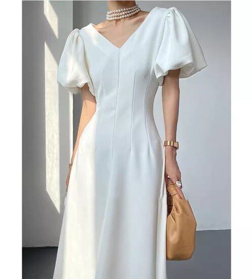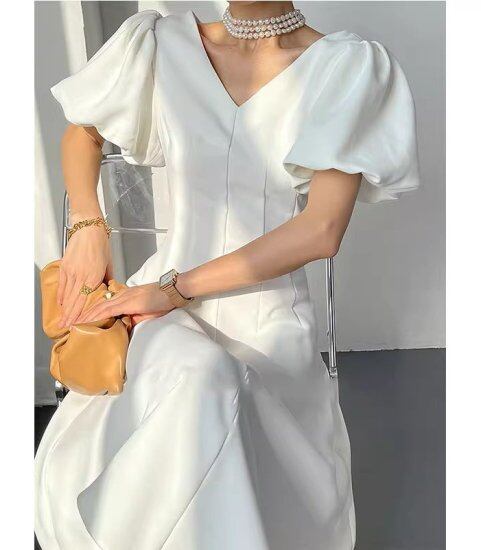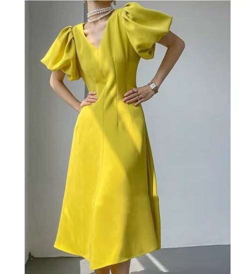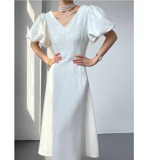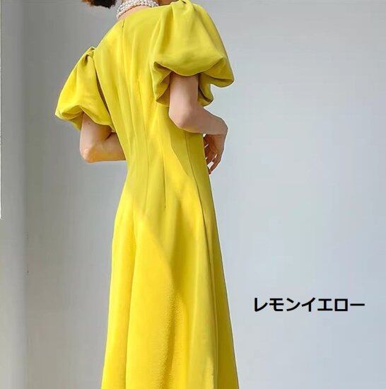 結婚式ドレス レディース パフスリーブ ミディアム丈 Vネック バルーンスリーブ タック Aライン 演奏会 発表会 披露宴 二次会 謝恩会 パーティードレス 無地 上品 きれいめ ワンピース