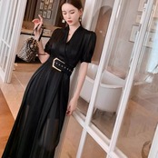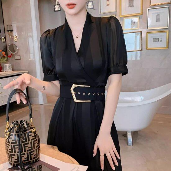 Vネックとハイウエストデザインですっきりとしたシルエットに♪