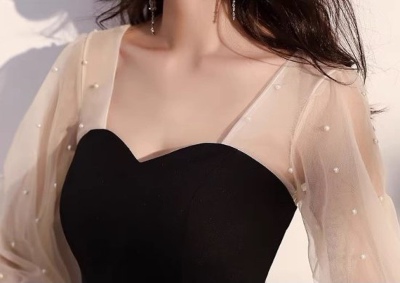結婚式ドレス レディース パール シースルー 透け感 ハートネック ミドル丈 チュールレース 長袖 パフスリーブ 演奏会 発表会 披露宴 ステージ衣装 パーティー イブニングドレス Aライン