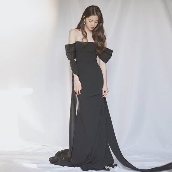 演奏会ドレス レディース ロングドレス オフショルダー 肩出し 無地 ロング丈 マキシ丈 結婚式 発表会 イブニングドレス カラードレス パーティードレス エレガント 華やか 黒 ブラックドレス