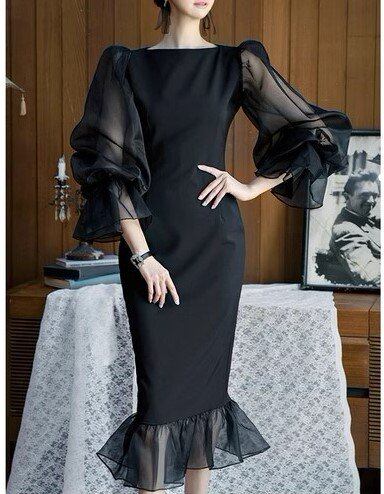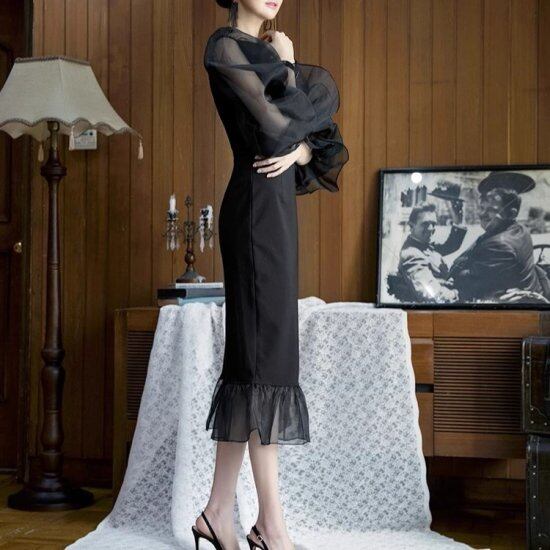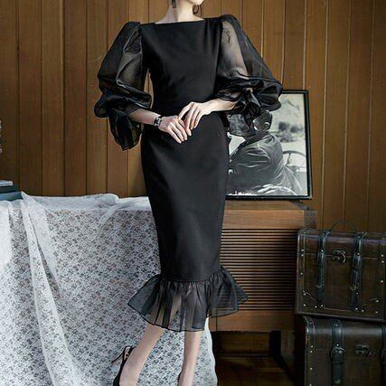 結婚式ドレス レディース パフスリーブ ボリューム袖 裾フリル 透け感 シアー マーメイド タイト 演奏会 発表会 披露宴 ステージ衣装 謝恩会 パーティー イブニングドレス 華やか エレガント