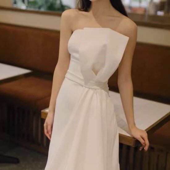 アシンメトリーデザインがおしゃれなホワイトロングドレス。