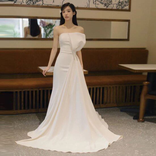 ウェディングドレス レディース 結婚式ドレス ノースリーブ チューブトップ リボン ロング丈 マキシ丈 Aライン 演奏会 二次会 パーティードレス 上品 エレガント シンプル 白 ロングドレス